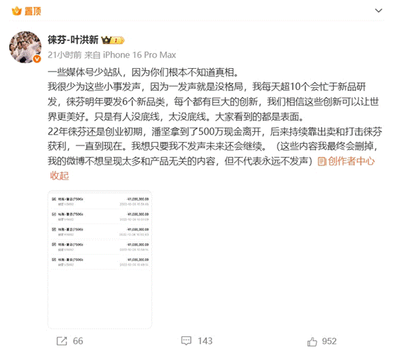 几小时后,叶洪新微博转发开炮,火力全开:“有瓜吃了!扒一扒独立评测怎么收费的!收钱可以,不能没良心!”更在评论区点名博主哥哥、徕芬前员工潘坚,质疑评测公正性的同时,直指其“收钱办事没良心”,暗示评测背后暗藏利益输送。