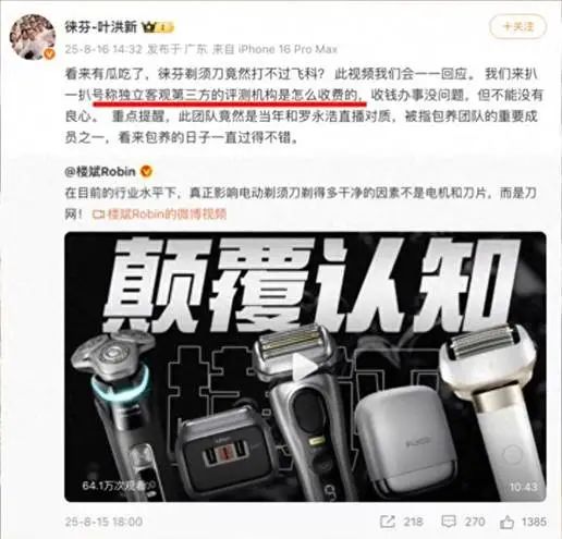 一场剃须刀评测,竟炸出徕芬创始人叶洪新与前员工潘坚的隔空开撕,掀起舆论风暴。