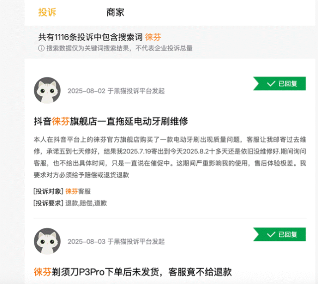 质量问题是徕芬最直观的危机。今年3月,江苏省东台市市场监管局抽查显示,徕芬吹风机因安全指标不达标被点名;黑猫投诉平台上,关于徕芬的投诉高达千条,多为外壳漏电、胶臭糊味、机壳开裂、机体发烫冒烟等质量问题,电动牙刷也出现失灵、无法充电等故障。