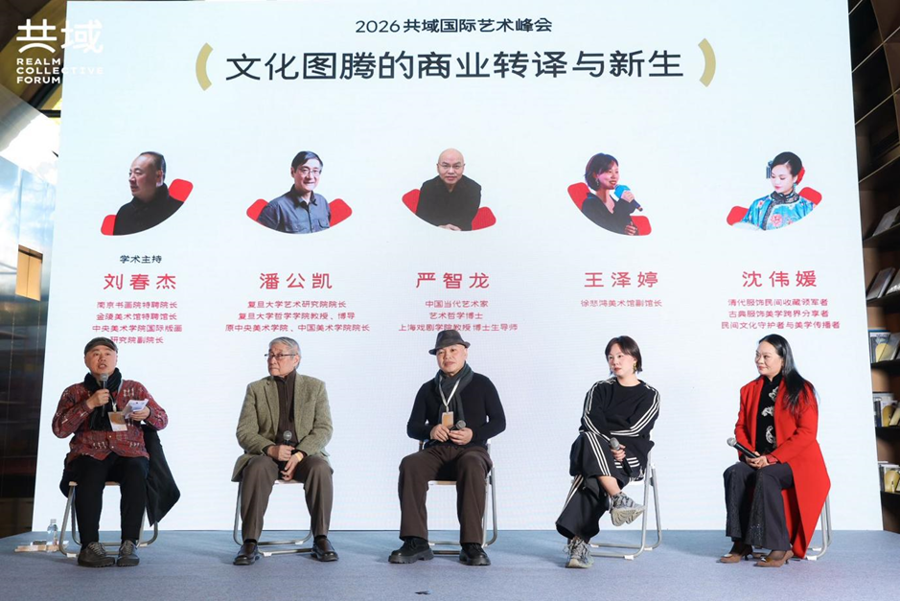 两场核心圆桌对谈接续登场,将现场思想激荡推向高潮。首场对谈聚焦“文化图腾的商业转译与新生”,由南京书画院特聘院长刘春杰担任学术主持。复旦大学艺术研究院院长潘公凯、当代艺术家严智龙、徐悲鸿美术馆副馆长王泽婷、清代服饰收藏与传播者沈伟媛等同台论道。嘉宾们围绕传统文化符号在当代消费社会中的叙事重构、价值转化与产业赋能等关键议题展开了深度探讨,为文旅融合与新消费浪潮提供了富有启发的实践思考。